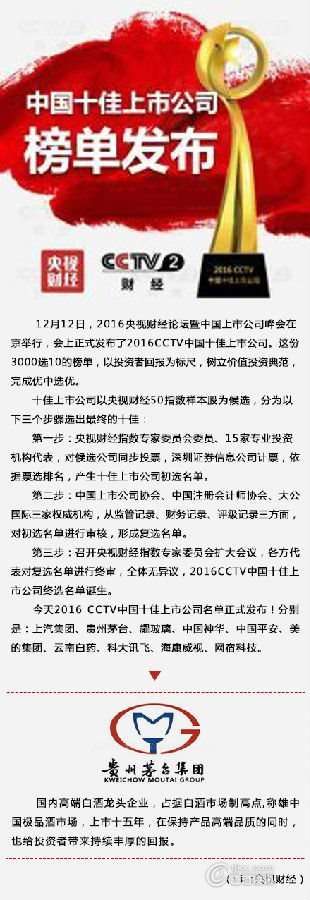 貴州茅臺榮獲2016CCTV中國十佳上市公司稱號