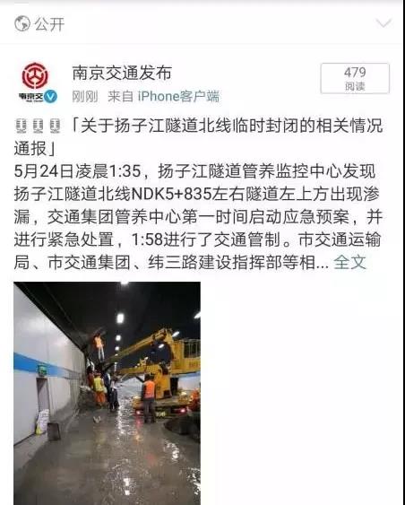 關(guān)于揚子江隧道北線臨時封閉的相關(guān)情況通報[摘要]??剛剛,南京市交通運輸局發(fā)布了【關(guān)于揚子江隧道北線臨時封閉的相關(guān)情況】通報。剛剛,南京市交通運輸局發(fā)布了【關(guān)于揚子江隧道北線臨時封閉的相關(guān)情況】通報。5月24日凌晨1:35,揚子江隧道管養(yǎng)監(jiān)控中心發(fā)現(xiàn)揚子江隧道北線NDK5+835左右隧道左上方出現(xiàn)滲漏,交通集團管養(yǎng)中心第一時間啟動應急預案,并進行緊急處置,1:58進行了交通管制。市交通運輸局、市交...