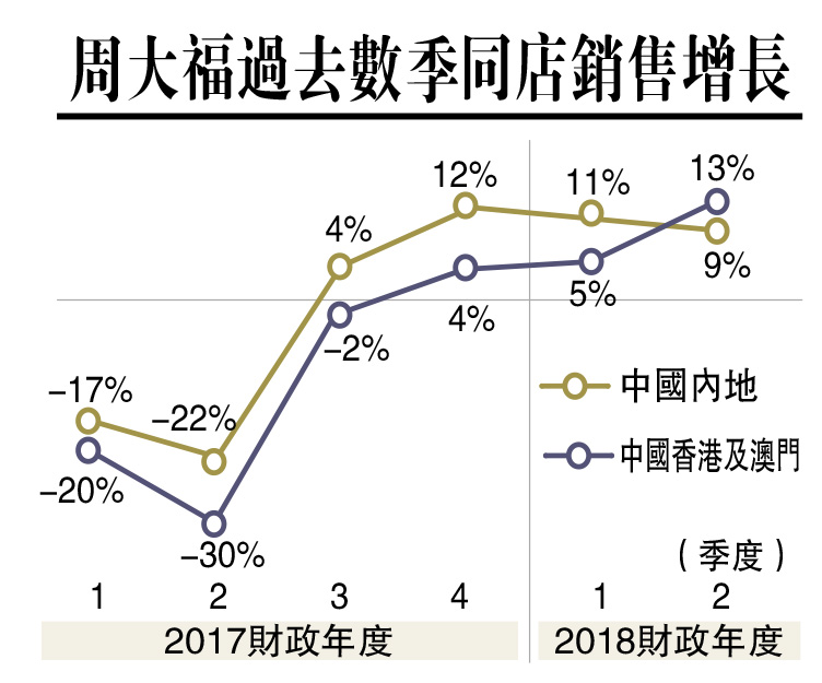 【大公報(bào)訊】記者林靜文報(bào)道:周大福(01929)昨公布截至今年九月底止第二季度經(jīng)營(yíng)數(shù)據(jù),香港及澳門(mén)市場(chǎng)上季同店銷(xiāo)售按年明顯改善,季內(nèi)同店銷(xiāo)售增幅按季由5%擴(kuò)大至13%,其中珠寶鑲嵌首飾同店銷(xiāo)售連跌13個(gè)季度后,首次錄得7%的正增長(zhǎng)。內(nèi)地市場(chǎng)方面,同店銷(xiāo)售增幅連跌兩季,上季從11%回落至9%。季度內(nèi),周大福港澳市場(chǎng)零售值增長(zhǎng)12%,同店銷(xiāo)量增長(zhǎng)12%;同店銷(xiāo)售亦從去年同期的-30%成功錄得正增長(zhǎng)。其...