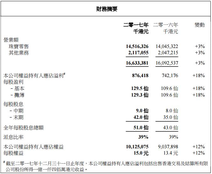 【億邦動力網(wǎng)訊】03月28日消息,據(jù)了解,周生生發(fā)布截至2017年年度業(yè)績,截止2017年12月31日,周生生營業(yè)額為166.33億港元,同比增長3%;公司權(quán)益持有人應(yīng)占溢利為8.76億港元,同比增長18%。除了以上數(shù)據(jù),你還需掌握的相關(guān)信息有:·3月27日,周生生發(fā)布截至2017年年度業(yè)績,截止2017年12月31日,周生生營業(yè)額為166.33億港元,同比增長3%;公司權(quán)益持有人應(yīng)占溢利為8.7...