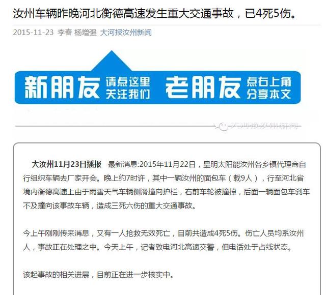大汝州11月23日播報最新消息:2015年11月22日,皇明太陽能汝州各鄉(xiāng)鎮(zhèn)代理商自行組織車輛去廠家開會。晚上約7時許,其中一輛汝州的面包車(載9人),行至河北省境內衡德高速上由于雨雪天氣車輛側滑撞向護欄,右前車輪被撞掉,后面一輛面包車剎車不及撞向該事故車輛,造成三死六傷的重大交通事故。今上午剛剛傳來消息,又有一人搶救無效死亡,目前共造成4死5傷。傷亡人員均系汝州人,事故正在處理之中。今天上午,記...