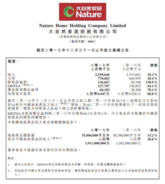 每股基本盈利顯著增長(zhǎng)80.8%\u00A0\u00A0地板產(chǎn)品總銷量創(chuàng)新高至約3,500百萬(wàn)平方米財(cái)務(wù)摘要收入增加10.1%至約人民幣25.5億元(2016年:約人民幣23.2億元)毛利增加20.4%至約人民幣7.77億元(2016年:約人民幣6.45億元)除稅前溢利增加1.3倍至約人民幣1.37億元(2016年:約人民幣5,919萬(wàn)元)EBITDA增長(zhǎng)64.1%至約人民幣2.28億元(2016年...