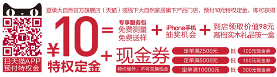 近半個月以來,大自然家居可謂是動作頻頻。從登陸各大紙媒頭版的“尋找前夫”啟事,到七夕大尺度“約睡”活動,無不引起了業(yè)界的關(guān)注和消費者的熱議。原來,在“金九銀十”來臨之前,大自然家居重拳出擊,聯(lián)合天貓啟動“睡地板野自在——超級品牌日”,不僅為消費者準(zhǔn)備了“野生原木系珍品全包入戶”優(yōu)惠,更提供了“預(yù)付享特權(quán)”、“曬得贏好禮”、“下單抽大獎”等多項重磅驚喜,搶先占據(jù)旺季家裝市場。十元特權(quán)定金,享多重禮品...