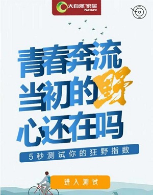 還記得小時候的夢想嗎?那些最初的野心,你是否還在堅守?現(xiàn)在大自然家居有一份關(guān)于夢想、關(guān)于野心的考卷,聽說它能檢測到你內(nèi)心深處的洪荒之力,也就是你的野心!什么考卷還說的神乎其神?就是所謂的H5野性測試——5秒鐘測試你的狂野指數(shù)。不得不說大自然家居這次獨具匠心,竟然想到用測試的方式來呼喚人們被消磨的所剩無幾的沖動、野心!筆者也只是暗搓搓的試了一下,原來在古代是帝王命格!能夠承載這種稱霸天下的野心的地板...