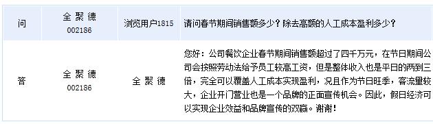 同花順財(cái)經(jīng)訊2月17日,全聚德在投資者關(guān)系互動(dòng)平臺(tái)上表示,公司餐飲企業(yè)春節(jié)期間銷售額超過(guò)了四千萬(wàn)元,在節(jié)日期間公司會(huì)按照勞動(dòng)法給予員工較高工資,但是整體收入也是平日的兩到三倍,完全可以覆蓋人工成本實(shí)現(xiàn)盈利,況且作為節(jié)日旺季,客流量較大,企業(yè)開(kāi)門營(yíng)業(yè)也是一個(gè)品牌的正面宣傳機(jī)會(huì)。因此,假日經(jīng)濟(jì)可以實(shí)現(xiàn)企業(yè)效益和品牌宣傳的雙贏。資料顯示:中國(guó)全聚德(集團(tuán))股份有限公司主營(yíng)業(yè)務(wù)為餐飲服務(wù)及食品加工銷售業(yè)務(wù)...