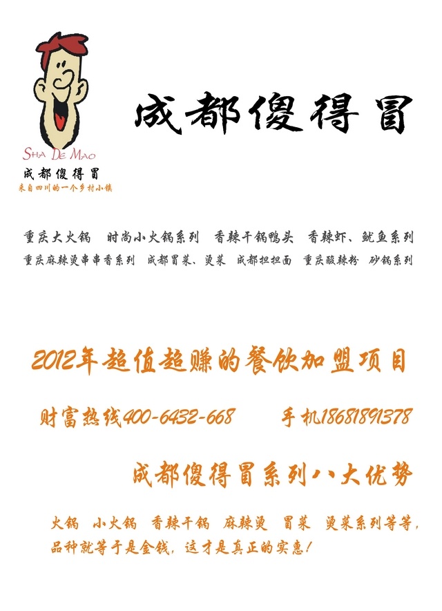 傻得冒! 重慶大火鍋,地道重慶火鍋,無后廚,無油煙,祖?zhèn)飨聛淼拿刂泼胤,獨特的口感,香濃回味,久吃不上火的最大特點,傳統(tǒng)的鴛鴦鍋底,紅湯鍋底,清湯鍋底,土雞鍋底,排骨鍋底,酸菜鍋底,番茄鍋底特色的干鍋鍋底,一鍋二吃,先吃后涮,香辣蝦,香辣魷魚,香辣鴨頭,香辣鴨翅,香辣鴨掌,香辣鳳爪干鍋等等!幾十幾種油碗小料,精品小吃,加盟大火鍋,贈送重慶地方特色小吃品種!