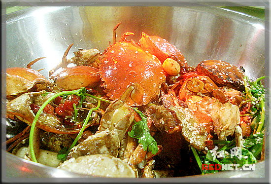 夏日炎炎,只有在夜晚才會(huì)感到稍許清涼,又到了好恰的長(zhǎng)沙人享受夜宵美食的季節(jié)。早就聽人說(shuō)西站有個(gè)九九香辣蟹店味道不錯(cuò),今日我們一行6人慕名而來(lái),這里的螃蟹可能是為了方便煸炒,端上來(lái)的時(shí)候已被零碎嶄成多塊,混在濃濃的紅油中讓人垂涎欲滴,本是紅黃相間,再配上白色的蒜子與青綠色的蔥段,這色,香,味中排名第一的“色”字讓人一見鐘情。迫不及待的夾一筷入口,先是一點(diǎn)兒辣,繼而又有點(diǎn)兒香,再咬一口下去,蟹肉嫩而香...