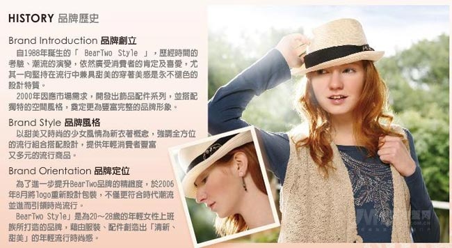 “BEAR TWO”以流行并略帶個(gè)性化的全系列組合商品為主,包括帽子、圍巾皮包、皮鞋、腰帶、襪子等飾品自由搭配組合。“BEAR TWO”以特色的專業(yè)剪裁,融合貼身、柔性、舒適的版型凸顯年輕女性的優(yōu)雅曲線。
