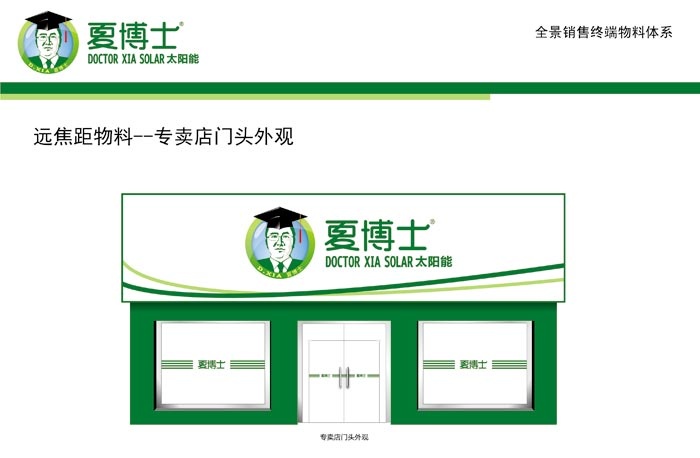 標志整體充滿生機盎然的綠色基調(diào),法人夏建業(yè),商標夏博士,喻指夏天般的熱情,博士般的胸懷,既表達企業(yè)精神與法人人格融為一體,又突現(xiàn)太陽能產(chǎn)品的環(huán)保特性形象統(tǒng)一,又體現(xiàn)太陽能企業(yè)的勃勃生機。頭像周圍圍繞天藍色,讓人們聯(lián)想到藍天、綠水,寓意著法人帶領企業(yè)言行一致融為一體為還家園一片綠天而孜孜不倦,又寓意企業(yè)無限發(fā)展空間。標志中間博士頭像,形象穩(wěn)重干練、可信、親和力強,體現(xiàn)了公司創(chuàng)始人自身要求的追求和對市場的承諾及品牌的專業(yè)水準和非凡魅力。充份表達出企業(yè)領導人自身的信心、形象的誠實與商業(yè)的共贏、社會的責任與感恩。