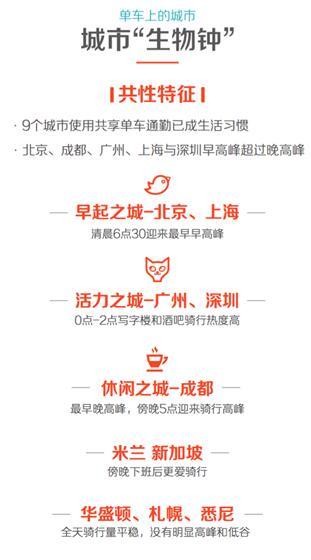 (原標(biāo)題:上海起最早、倫敦騎最快、悉尼耐力好這個報(bào)告你看過嗎?)圖片說明:城市“生物鐘”的相關(guān)數(shù)據(jù)。東方網(wǎng)記者王佳妮1月12日報(bào)道:全球首部共享單車與城市可持續(xù)發(fā)展報(bào)告今日公布。該報(bào)告由摩拜單車聯(lián)合世界資源研究所發(fā)布,對北京、上海、廣州、深圳、成都及倫敦、華盛頓等12座城市通過定性定量分析,探究騎行對城市出行結(jié)構(gòu)、城市環(huán)境、城市生活、節(jié)能減排等領(lǐng)域帶來的改變。報(bào)告顯示,上海市民騎行時間最早,抗霾最...