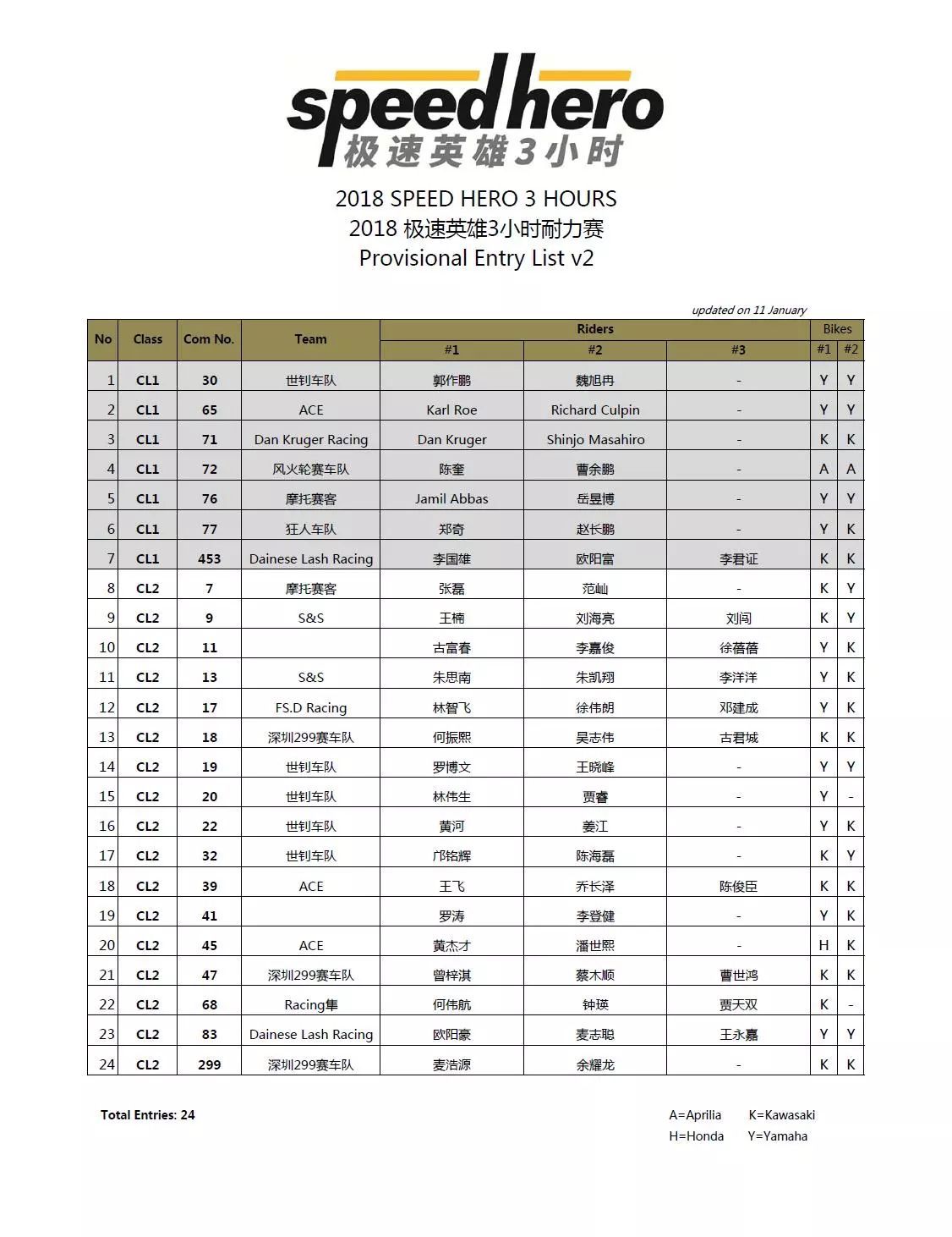 2018年極速英雄3小時耐力賽-暫定參賽名單