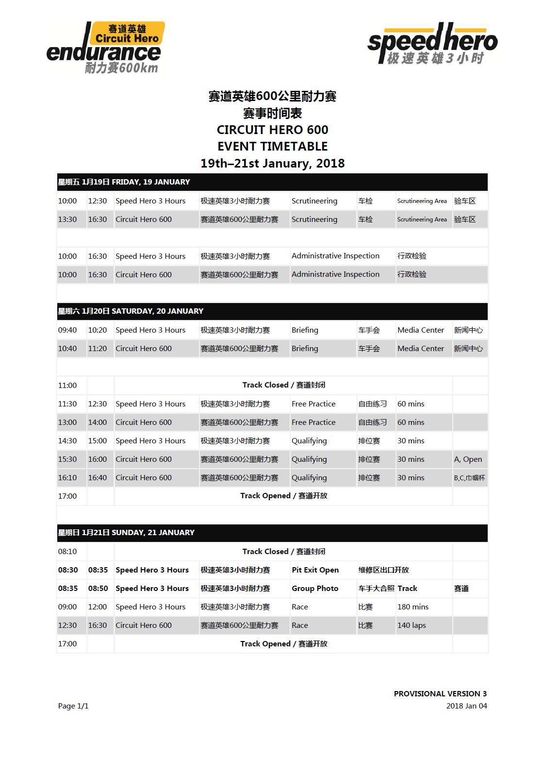 2018年賽道英雄600公里耐力賽-暫定時間表