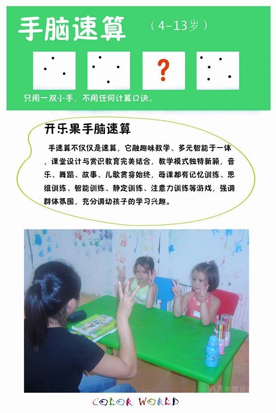 手速算不僅僅是速算,它融趣味數(shù)學(xué)、多元智能于一體,課堂設(shè)計與賞識教育完美結(jié)合,教學(xué)模式獨(dú)特新穎,音樂、舞蹈、故事、兒歌貫穿始終,每課都有記憶訓(xùn)練、思維訓(xùn)練、智能訓(xùn)練、靜定訓(xùn)練、注意力訓(xùn)練等游戲,強(qiáng)調(diào)群體氛圍,充分調(diào)動孩子的學(xué)習(xí)興趣。