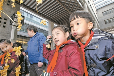 12月18日,浙江省杭州新世紀(jì)外國(guó)語(yǔ)學(xué)校學(xué)生在“畫家爸爸”的帶領(lǐng)下,來(lái)到中國(guó)美術(shù)學(xué)院大門口欣賞大學(xué)生用落葉設(shè)計(jì)的作品《葉簾》。這是該校每月組織學(xué)生開(kāi)展“走杭州”社會(huì)實(shí)踐的一項(xiàng)內(nèi)容,學(xué)校家委會(huì)的家長(zhǎng),發(fā)揮各自行業(yè)優(yōu)勢(shì),為孩子們認(rèn)知社會(huì)打開(kāi)一扇窗。本報(bào)記者\(yùn)u00A0鮑效農(nóng)\u00A0攝《中國(guó)教育報(bào)》2017年12月19日第1版\u00A0...