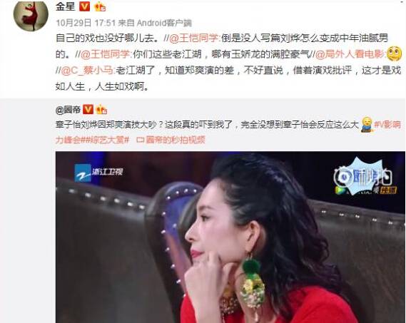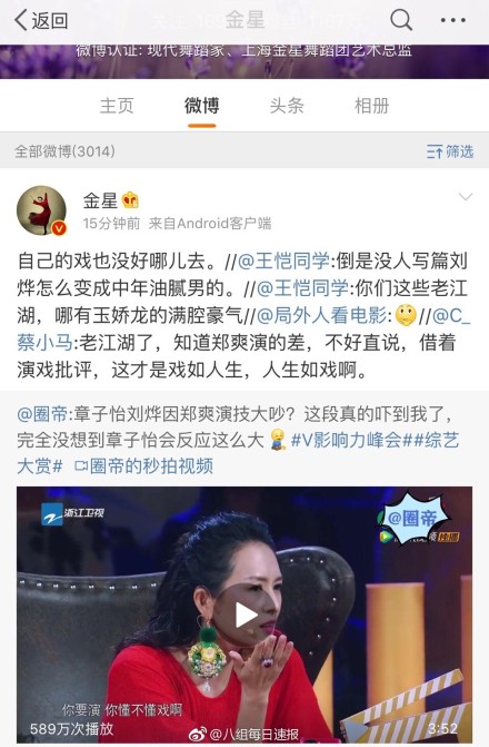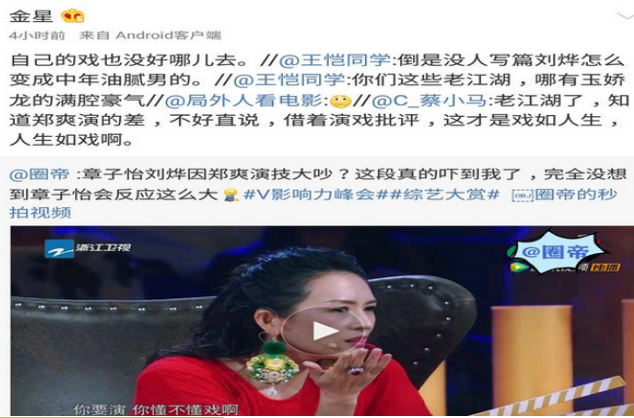 《演員的誕生》最近頻上熱搜,由章子怡、劉燁、宋丹丹擔(dān)任評(píng)委,影帝影后坐鎮(zhèn)效果非同凡響,第一期就因?yàn)猷嵥萘?xí)過程中頻頻笑場(chǎng)導(dǎo)致章子怡發(fā)火,而劉燁一心維護(hù)鄭爽,兩人火藥味都很濃,劉燁氣得拍手機(jī),而章子怡更是直接拎起劉燁的鞋扔了。雖然之后兩人打圓場(chǎng)是在進(jìn)行“殿堂級(jí)”的吵架,不過一時(shí)之間網(wǎng)友也是對(duì)此議論紛紛。而我們撕遍整個(gè)娛樂圈無敵手的著名主持人金星老師也坐不住了,轉(zhuǎn)發(fā)關(guān)于章子怡劉燁爭(zhēng)吵視頻的時(shí)候含沙射影...