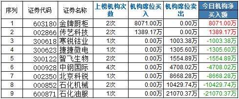 機(jī)構(gòu)追蹤(機(jī)構(gòu)操作比較少,機(jī)構(gòu)馬甲操作兩次新股!)金牌櫥柜為開板次新股,兩機(jī)構(gòu)席位介入8071萬,并且東川路介入2993萬,并且榮超也有介入,一般情況下東川路的營業(yè)部都會(huì)有機(jī)構(gòu)馬甲席位,以此判斷介入機(jī)構(gòu)席位可能是游資馬甲席位概率較高。傳藝科技(行情002866,診股)同樣也是次新股,兩機(jī)構(gòu)席位介入1389萬,應(yīng)該是短線機(jī)構(gòu)席位買入。石化油服(行情600871,診股)為油改概念股,今日強(qiáng)勢漲停,機(jī)構(gòu)...