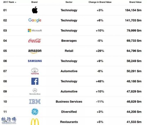 2017全球最具價值品牌排行榜top100,耐克阿迪上榜