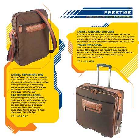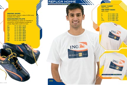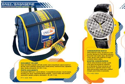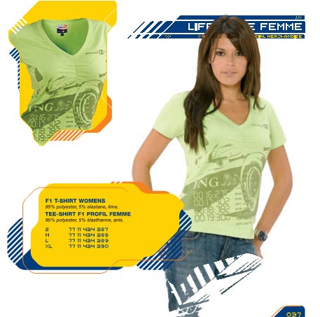 來(lái)自法國(guó)的Renault F1 Team豪華時(shí)尚品牌,包括Lifestyle休閑裝,Replica時(shí)尚運(yùn)動(dòng)裝,及高級(jí)箱包、皮具、鞋帽、手表、車(chē)模及配飾。承繼法國(guó)式的簡(jiǎn)約浪漫,彰顯年輕、時(shí)尚、激情、挑戰(zhàn)的品牌風(fēng)格。色彩明麗,以深藍(lán)色、檸檬黃、橙色為主色調(diào),配以白色、銀灰,成功彰顯健康時(shí)尚的品牌特質(zhì);款式簡(jiǎn)約、大氣,充滿(mǎn)時(shí)尚、浪漫和運(yùn)動(dòng)氣息;統(tǒng)一定制的高檔面料,穿著舒適,極具輕松感,和尊崇品味。