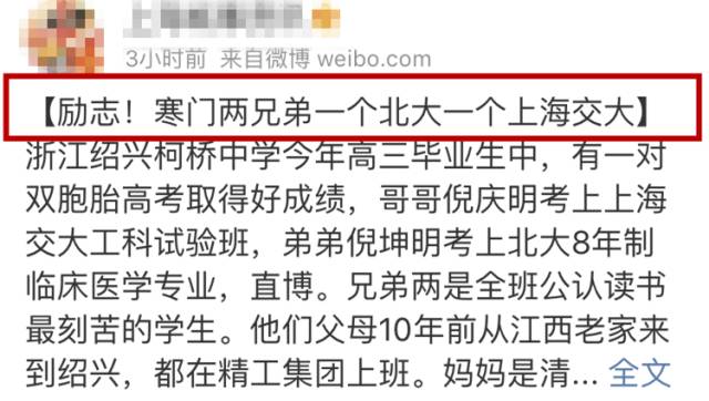 原標題:勵志!外來務工家庭雙胞胎兄弟,一個北大一個交大,誰說寒門難出貴子?最近,一對寒門出身的雙胞胎兄弟火了!在2017年的高考中,哥哥倪慶明考上上海交大工科試驗班,弟弟倪坤明考上北大8年制臨床醫(yī)學專業(yè)。誰說寒門不能出貴子?這兩兄弟就用勤奮書寫出了自己的勵志人生!一對雙胞胎兄弟刷屏網(wǎng)絡哥哥倪慶明考上上海交大工科試驗班弟弟倪坤明考上北大8年制臨床醫(yī)學專業(yè)(直博)兩人都在精工集團上班爸爸老倪是給鋼結構...