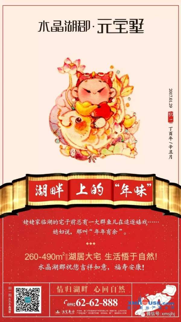 湖畔上的“年味”姥姥家臨湖的宅子前總有一大群魚兒在追逐嬉戲……媳婦說,那叫“年年有余”260-490?湖居大宅生活悟于自然水晶湖郡祝您吉祥如意,福壽安康情歸湖畔心歸自然...