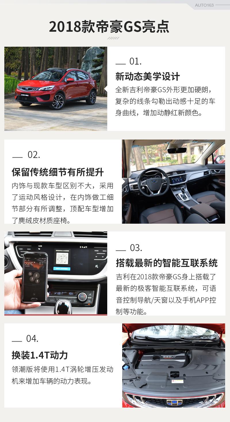 帝豪GS是吉利品牌在2016年推出的首款跨界SUV車型,該產品主打國內年輕消費群體,基于兩年的市場銷量變化以及用戶的使用反饋,也為了能更好的適應目前國內汽車消費市場,帝豪GS在2018年進行了全新的改款升級,新車相對于現(xiàn)款車型在外觀和細節(jié)上做出了優(yōu)化,同時動力方面也換裝了全新的1.4T渦輪增壓發(fā)動機。●換裝1.4T發(fā)動機駕駛感受變化明顯由于換裝的動力系統(tǒng)是重頭戲,我們在文章的一開始就給大家講述一下...