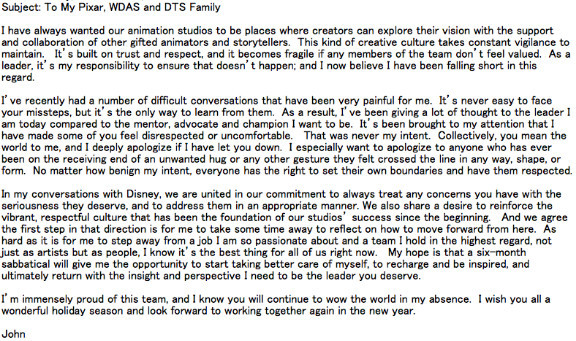 新浪娛樂(lè)訊迪士尼/皮克斯的領(lǐng)導(dǎo)約翰·拉塞特為越界行為道歉。宣布休假半年——性騷擾事件討論在好萊塢持續(xù)發(fā)酵,迪士尼首席創(chuàng)意官兼迪士尼動(dòng)畫(huà)主席約翰·拉塞特在一條公司備忘錄中宣布:他為對(duì)員工的一些“越界行為”道歉,他稱(chēng)將立即休假6個(gè)月,明年回公司。詳細(xì):動(dòng)畫(huà)大佬拉塞特作為皮克斯創(chuàng)始人,打造了《玩具總動(dòng)員》《機(jī)器人瓦力》《冰雪奇緣》《無(wú)敵破壞王》等著名動(dòng)畫(huà),而他和人激情相擁的習(xí)慣也為人所熟知。#韋恩斯性騷...