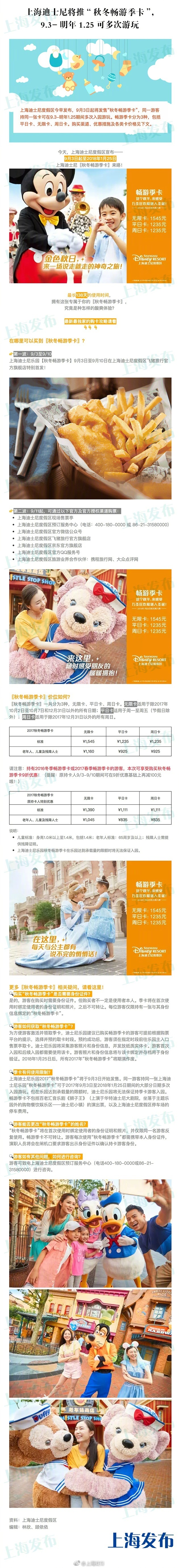[上海迪士尼將推“秋冬暢游季卡”,9.3-明年1.25期間可多次游玩]想在秋冬天找最愛的迪士尼朋友求擁抱求溫暖嗎?@上海迪士尼度假區今早發布,9月3日起將發售“秋冬暢游季卡”,同一游客持同一張卡可在9.3-明年1.25期間多次入園游玩。暢游季卡分為3種,包括平日卡、無限卡、周日卡。購買渠道及各類卡價格見附圖...