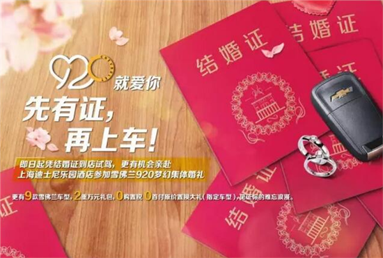 9款車型2重萬元禮包0元購車原價置換大禮雪佛蘭920享愛特惠季\u00A0給你滿滿的愛想與心愛的TA在迪士尼舉行一場浪漫的夢幻婚禮嗎?想在迪士尼城堡下許下一生的承諾,想與TA在車中,來一場說走就走的旅行嗎?婚禮與好車,雪佛蘭全都帶給你!跳動的心相約迪士尼,夢幻婚禮等你來各位有意向購車的新人們注意了!即日起憑結婚證到雪佛蘭經銷店試駕,即有機會親赴上海迪士尼樂園酒店參加“雪佛蘭920夢幻集體婚禮”,共...