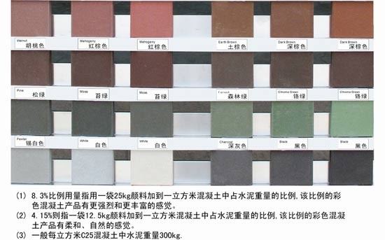 配色簡(jiǎn)便:系統(tǒng)已完成混合比例計(jì)算,只需在素色混凝土中按色卡所選顏色編碼定量投入顏料即可;