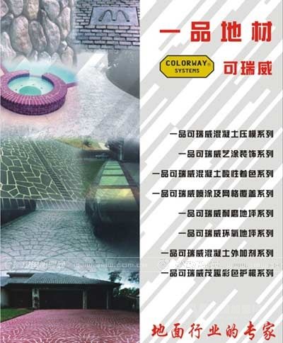 公司擁有全面的混凝土地面裝飾材料(包括混凝土壓模系列,酸性著色系列和噴涂及網(wǎng)格覆蓋系列)和施工所需的工具、模具等全系列的生產(chǎn)、制造和研究開發(fā)的能力;炷翂耗O盗惺且环N能夠無比真實(shí)地再現(xiàn)自然紋理的混凝土壓模系統(tǒng)。該產(chǎn)品具有整體性強(qiáng)、抗壓、抗折、強(qiáng)度高、不變色、不粉化、耐磨、經(jīng)久耐用等特點(diǎn)?蓮V泛應(yīng)用于各種功能的道路、墻面,同時(shí)還可以作為地面增加強(qiáng)度的填充材料。