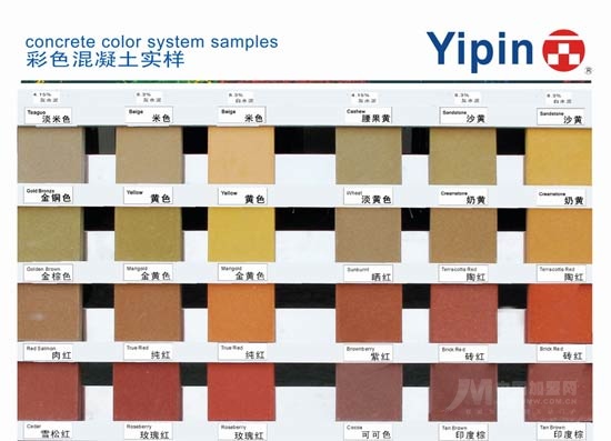 一品從澳洲ColorLinx引進(jìn)、開發(fā)的彩色混凝土系統(tǒng)使混凝土攪拌廠商產(chǎn)品從單色變?yōu)锳 自然色、B 強(qiáng)烈色、C 鮮艷色三個(gè)系列的48色,滿足市場(chǎng)需求,提升商品混凝土廠商產(chǎn)品檔次,具有色譜齊全、配色簡(jiǎn)便、換色方便、環(huán)境清潔、色彩自然等五大特點(diǎn),適用于所有預(yù)拌或預(yù)制商品混凝土,大型工程效果更佳: