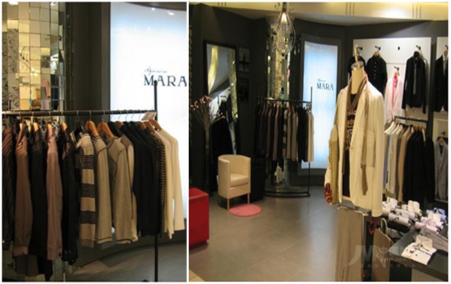 “Mara ” 為典型的的韓版熱銷貨品類型,道具設(shè)計(jì)有個(gè)性、 時(shí)尚,白色道具與黑胡桃木色地臺相結(jié)合,加上很正的紅色LOGO形象板{金色 LOGO},配上時(shí)尚的肌理噴砂玻璃及點(diǎn)光源,色彩明快,道具廳房形象肯定 一流。以配合 展示出樣為主導(dǎo)而帶動貨品銷售高峰,設(shè)計(jì)師還是采用了臺灣 彩色定形模特配上時(shí)尚發(fā)型突出該品牌的主題定位。