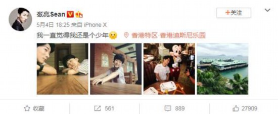 張亮天天游迪士尼 靠米老鼠合影自稱少年