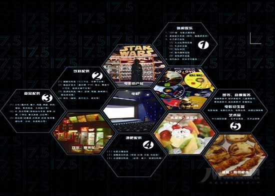 “1”即電影;“X”即圍繞電影展開的:酒吧、電影點(diǎn)播、休閑飲食、音像書店、娛樂游戲、電影后產(chǎn)品等多種經(jīng)營(yíng)。