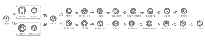 從影院選址設(shè)計(jì)、裝修建設(shè)、全套辦證、設(shè)備安裝,到人員培訓(xùn)、設(shè)備應(yīng)用培訓(xùn)、廣告推廣,直到投入運(yùn)營(yíng)管理,全程跟進(jìn)。