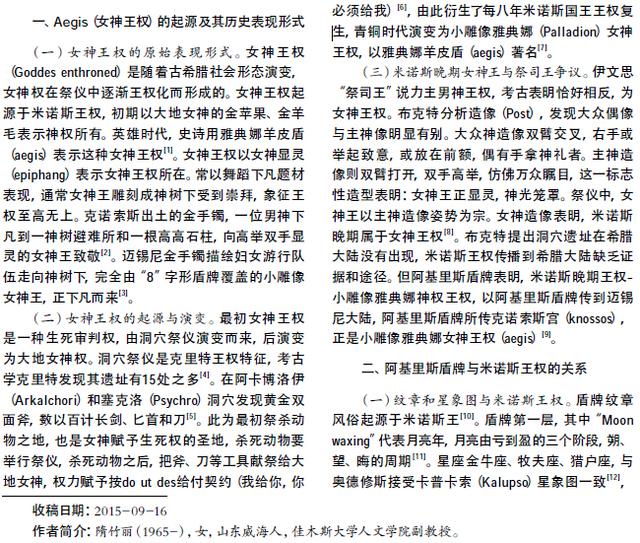 【摘要】古希臘Polis是個公民權的社會,其發(fā)展與演變一直是在女神王權(aegis)保護下完成的。女神王權起源于米諾斯王權,形成于英雄時代的阿基里斯盾牌,演變?yōu)檠诺淠刃〉裣裆駲嗤鯔嗪桶⒉_王權,荷馬時代演變成了赫拉、小雕像雅典娜、海倫等神權王權代表,形成與阿伽門農(nóng)所代表邁錫尼王權本質(zhì)區(qū)別。【關鍵詞】盾牌Aegis雅典娜;米諾斯王權邁錫尼王權...