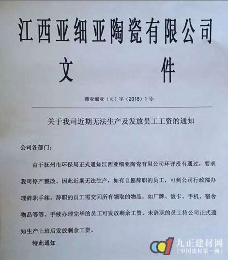 日前,一則關(guān)于江西亞細(xì)亞有限公司近期無(wú)法生產(chǎn)及發(fā)放員工工資的通知在微信朋友圈,以及QQ群上流傳。據(jù)了解,由于環(huán)評(píng)未通過(guò),江西有限公司面臨停產(chǎn)整改的局面。另悉,江西亞細(xì)亞陶瓷有限公司與上海亞細(xì)亞磁磚并無(wú)關(guān)系。江西亞細(xì)亞陶瓷停產(chǎn)整改關(guān)于我司近期無(wú)法生產(chǎn)及發(fā)放員工工資的通知由于撫州市環(huán)保局正式通知江西亞細(xì)亞陶瓷有限公司環(huán)評(píng)沒(méi)有通過(guò),要求我司停產(chǎn)整改。因此近期無(wú)法生產(chǎn),如有自愿辭職的員工,可到公司行政部辦...