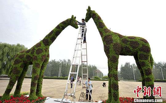濟南巨型綠植長頸鹿“點睛”迎國慶