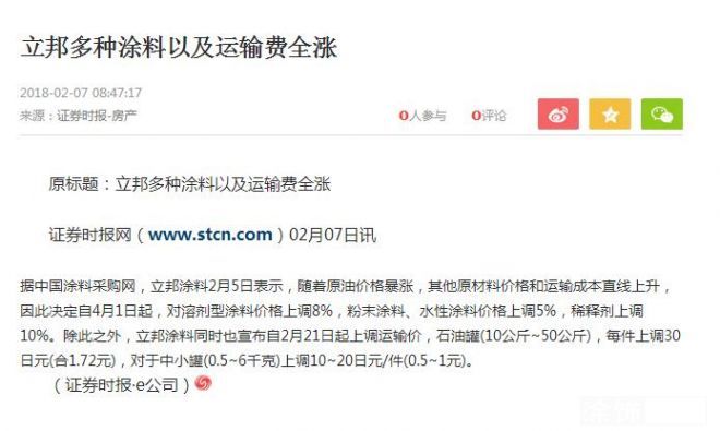 “立邦產(chǎn)品漲價”報道截圖近日,國內(nèi)多家行業(yè)媒體盛傳“立邦產(chǎn)品要漲價”的消息,指出從2018年4月1日起立邦將對涂料產(chǎn)品的價格進行8%-10%的上調(diào)。事情真的是這樣嗎?據(jù)涂飾商情記者了解,當前業(yè)內(nèi)流傳的“立邦產(chǎn)品要漲價”的消息源自日本涂料株式會社(NipponPaintCo.,Ltd.,以下簡稱“日涂”)于2月5日所發(fā)調(diào)價公告。公告指出,鑒于原材料價格高漲,從4月1日起,對日涂的產(chǎn)品價格進行調(diào)整。其...