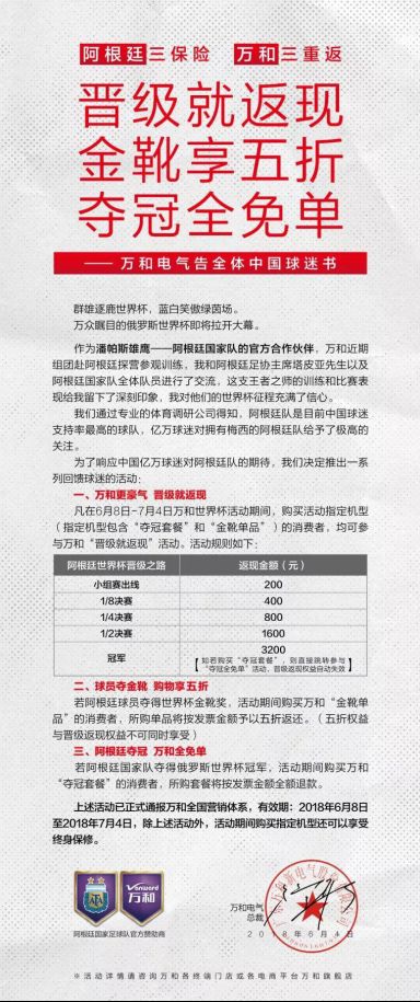 新浪財(cái)經(jīng)訊近日,萬和電氣(002543,股吧)在世界杯舉行期間發(fā)布產(chǎn)品活動(dòng)消息稱,如果阿根廷隊(duì)晉級(jí)就返現(xiàn),球員拿金靴可以打五折,若最終奪冠就享免單大禮。同時(shí)萬和電氣稱,若阿根同隊(duì)奪得俄羅斯世界別冠軍,活動(dòng)期間購(gòu)買萬和“奪冠套餐”的消費(fèi)者是,所購(gòu)套餐將按發(fā)票金額全額退款。7月1日凌晨,世界杯1/8決賽法國(guó)與阿根廷上演強(qiáng)強(qiáng)對(duì)決,最終法國(guó)4-3戰(zhàn)勝阿根廷。從戰(zhàn)況來看,萬和電氣此次活動(dòng)將對(duì)每位參與的消費(fèi)者...