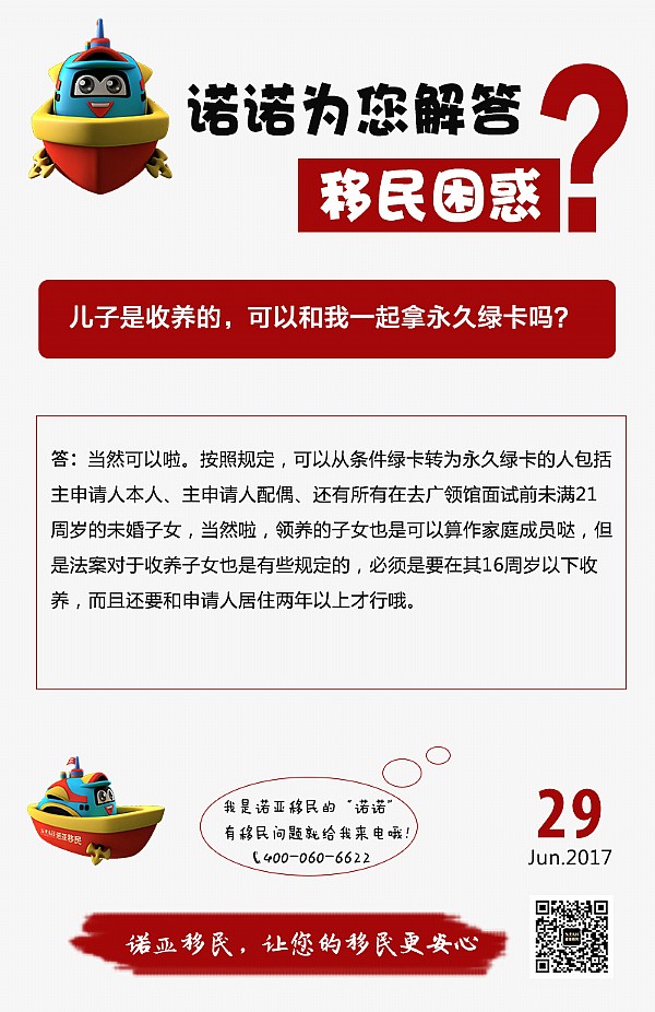 諾亞美國投資移民問答:兒子是收養(yǎng)的,可以和我一起拿永久綠卡嗎
