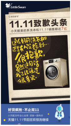 小天鵝洗衣機節(jié)后道歉?原來亮點在這里!11.11的盛典狂歡漸漸落下帷幕,各大商家紛紛打掃戰(zhàn)場,小天鵝洗衣機今年取得耀眼佳績!11.11當天,小天鵝洗衣機銷售額6分鐘破1億!30分鐘達2.93億!1.5小時破5億!2小時達5.47億!10個小時突破6.88億,超去年雙11全天銷售額!11.11當天總銷售額近7億!戰(zhàn)績斐然,可喜可賀!但在大家都祝賀歡慶的時候,出人意料的事情發(fā)生了,小天鵝洗衣機節(jié)后突然...