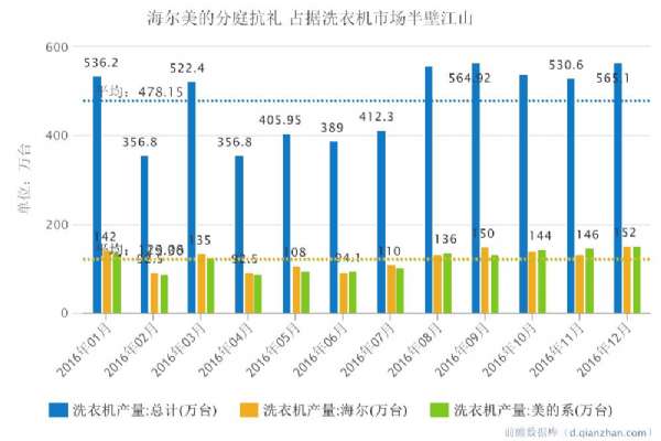 >>科技買手,全網尖兒貨打折/特賣推薦平臺<<據前瞻數據庫數據顯示,2016年12月我國洗衣機產量為565.1萬臺,其中海爾洗衣機產量當月值為152萬臺,美的系產量為151萬臺,雙方勢均力敵。以下為2016年洗衣機產量統計及海爾美的品牌份額:2016年我國宏觀經濟仍然面臨著巨大的壓力,GDP同比增長6.7%,增速創下自1990年以來的新低。早已進入存量市場的洗衣機行業市場需...