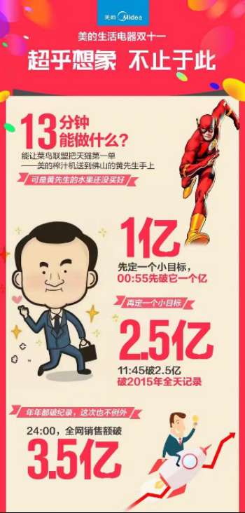 (原標題:一天賣了上半年電商1/4美的打體育營銷牌“引流”)華夏時報(公眾號:chinatimes)記者盧曉深圳報道為家電企業帶來更多的銷售“流量”。集團公布其2016年“雙十一”的全網銷售數額為27.1億,同比增加92.9%。這個數字在美的兩年前的“雙11”當天僅有7.1億元,而在2015年則為14.3億元。美的集團此前在2016年半年報中披露,上半年其整體銷售超過100億元,同比增長57%,電...