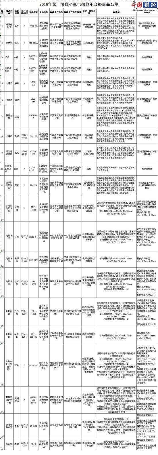 (原標(biāo)題:江蘇省工商局抽檢小家電商品榮事達(dá)電一款熱水壺不合格)中國網(wǎng)財(cái)經(jīng)1月5日訊江蘇省網(wǎng)站日前公布2016年上半年全省流通領(lǐng)域小家電商品質(zhì)量抽檢結(jié)果,共計(jì)抽檢100批次,79批次合格,21批次上榜,不合格項(xiàng)目為插頭插腳長度。據(jù)悉,檢驗(yàn)的主要項(xiàng)目包括標(biāo)志和說明、對觸及帶電部件的防護(hù)、輸入功率和電流、發(fā)熱、工作溫度下的泄漏電流和電氣強(qiáng)度、穩(wěn)定性和機(jī)械危險、機(jī)械強(qiáng)度、結(jié)構(gòu)、內(nèi)部布線、電源連接和外部軟線...