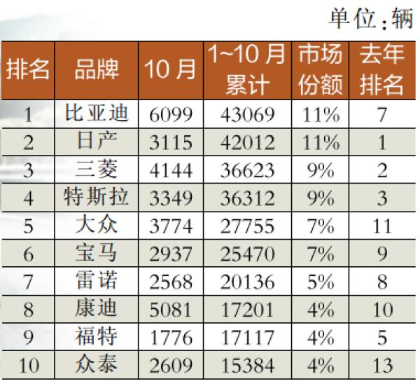 在剛剛出爐的全球新能源汽車銷量排行榜上,比亞迪不負(fù)眾望,再次橫掃美、日、德等汽車企業(yè),又一次登上了10月單月銷量榜首的位置。至此,在連續(xù)6個(gè)月銷量第一之后,比亞迪1~10月的累計(jì)銷量也終于拔得頭籌。單月、累計(jì)銷量雙雙第一,奠定了比亞迪在新能源行業(yè)的霸主地位,也標(biāo)志著比亞迪正式成為全球最大的新能源汽車企業(yè),這也幫助中國汽車企業(yè)實(shí)現(xiàn)了在新能源領(lǐng)域質(zhì)的飛躍。國內(nèi)部分車企新能源汽車1~10月銷量排行■先聲...