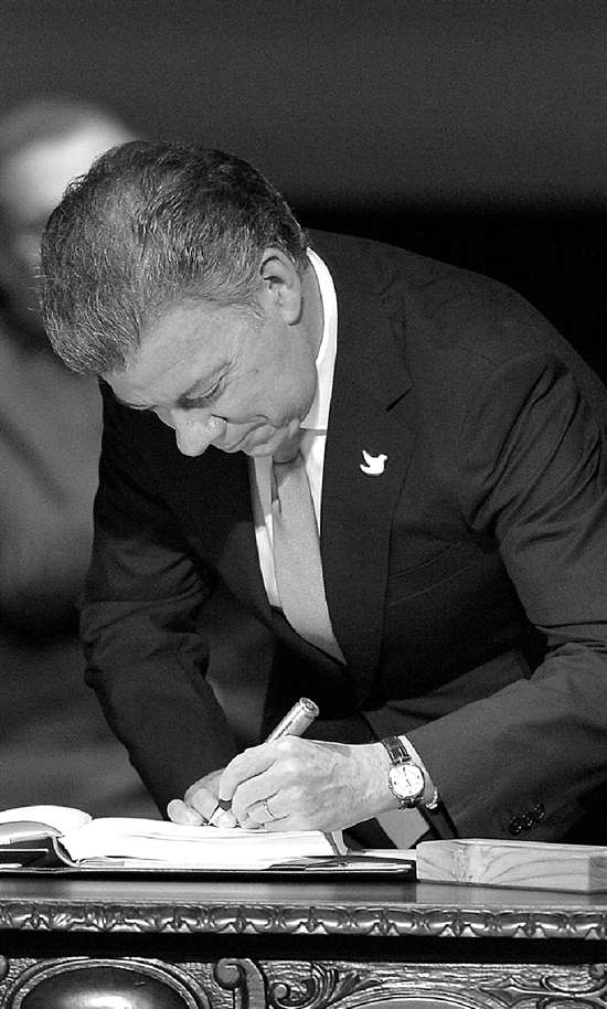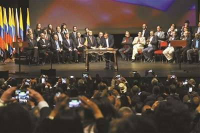 原標(biāo)題:哥倫比亞新和平協(xié)議終于簽了當(dāng)?shù)貢r間11月24日,哥倫比亞總統(tǒng)和反政府武裝“哥武”領(lǐng)導(dǎo)人正式簽署和平協(xié)議供圖/視覺中國哥倫比亞總統(tǒng)桑托斯和該國最大反政府武裝“哥倫比亞革命武裝力量”(簡稱“哥武”)領(lǐng)導(dǎo)人羅德里格?隆多尼奧?埃切韋里24日在哥首都波哥大正式簽署新的和平協(xié)議。此前,哥倫比亞民眾公投否決了最初達(dá)成的和平協(xié)議,雙方遭遇誤解后繼續(xù)談判,在征求反對派意見并大幅修改協(xié)議內(nèi)容之后,最終達(dá)成一...