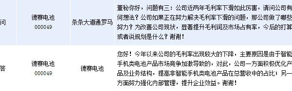 全景網12月11日訊周五德賽電池(000049)在全景網互動平臺上表示,今年以來公司的毛利率出現(xiàn)較大的下降,主要原因是由于智能手機類電池產品市場競爭加劇導致的,對此,公司一方面積極優(yōu)化產品及業(yè)務結構,提高非智能手機類電池產品在總營收中的占比;另一方面努力強化內部管理,提升企業(yè)效益。德賽電池主營業(yè)務為無汞堿錳電池,一次鋰電池,鋅空氣電池,鎳氫電池,鏗聚合物電池,燃料電池及其他種類電池,電池材料,配件...