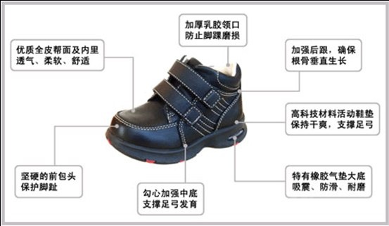 1)童鞋應該有堅硬的后跟,足夠防震的鞋墊以及內(nèi)置的足弓承托。同時,它應該能夠在足的前掌處,而不是在鞋的中間部位隨著腳的彎曲而靈活的彎曲。