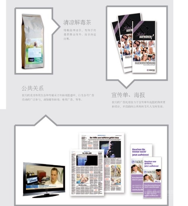 成功的市場營銷策略作為我們的經(jīng)營理念里重要的組成部分,其基石在于對協(xié)力優(yōu)勢的充分運用。廣告的協(xié)力優(yōu)勢通過現(xiàn)已有的機構(gòu)網(wǎng)絡(luò)建立。借助于有詳細圖釋說明的網(wǎng)頁服務(wù),以及對成功戒煙者近況的及時更新,我們的新聞覆蓋率節(jié)節(jié)上升。我們在不同地區(qū)以及全球范圍內(nèi)對 Facilitas采用各方位的市場營銷活動。在合作的開始階段,我們將協(xié)同您一起制作市場營銷計劃書。另外,在此重要環(huán)節(jié),我們還將邀請廣告代理Early&Bird參與協(xié)助。我們非常重視公司統(tǒng)一標(biāo)識的使用。作為經(jīng)營合作伙伴,您也將參與網(wǎng)站的使用。除此之外,你還將獲得所有市場營銷所需材料的使用權(quán)。